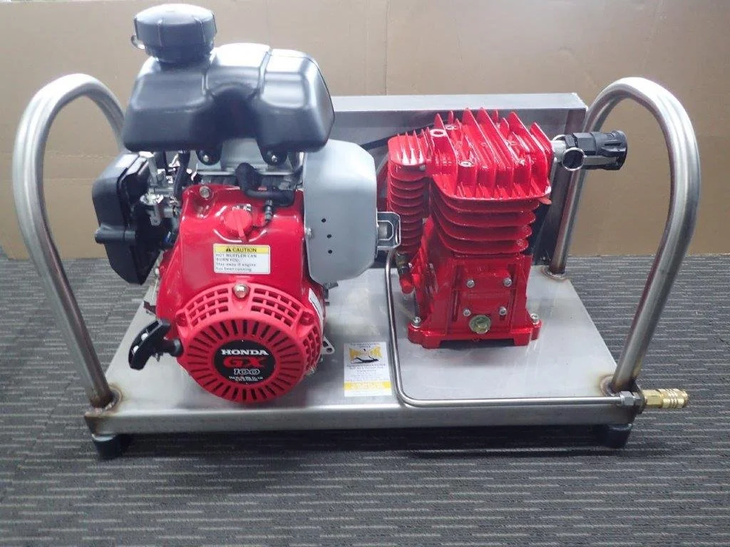 Powered by the Honda GX160 (the Flagship model in Honda's world-renowned GX Engine range) and paired with the ABAC 19cfm that features an after cooler and cast iron cylinders the Wolf-Air Petrol dive compressor is easy to use , super durable and fuel efficient without sacrificing horse power.